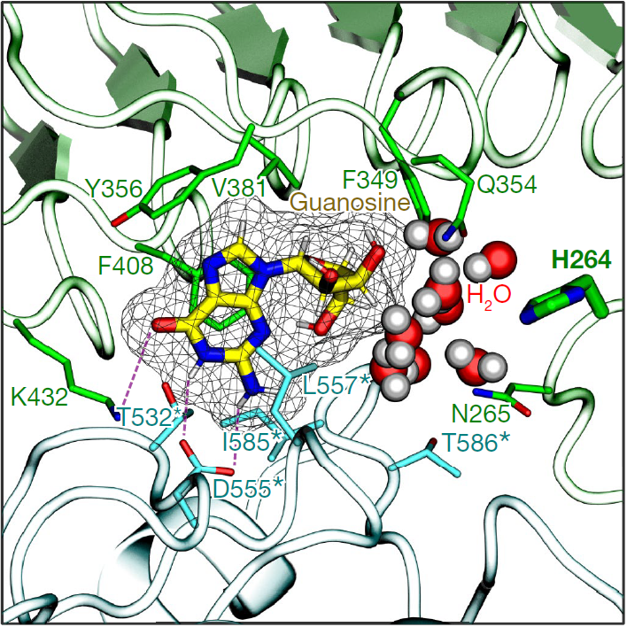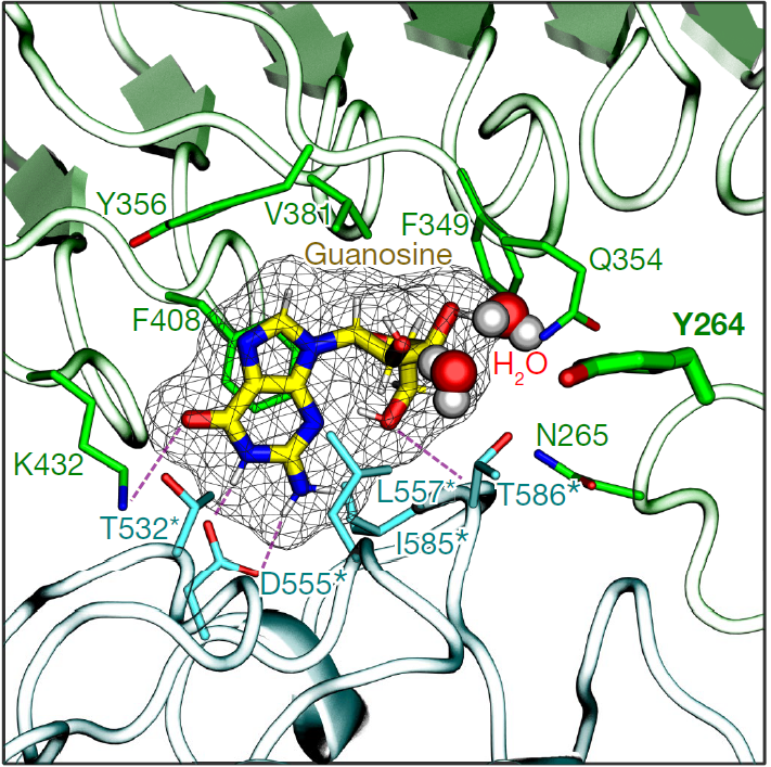 注:左圖為正常的TLR7結(jié)構(gòu)圖,右圖為突變后的TLR7結(jié)構(gòu)圖。突變發(fā)生在位點(diǎn)Y264處,突變?yōu)镠264。中心的網(wǎng)狀區(qū)域結(jié)構(gòu)為鳥(niǎo)苷,突變后的TLR7可以與鳥(niǎo)苷形成更多的氫鍵。根據(jù)分子動(dòng)力學(xué)的模擬結(jié)果,這提升了二者之間的親和力。