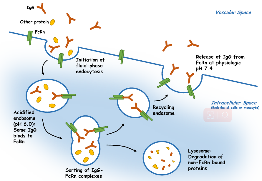 對于正常單克隆抗體和IgG樣BsAb,與新生兒受體(FcRn)的相互作用可以阻止它們在細胞內(nèi)攝取后被溶酶體降解。 類似于內(nèi)源性IgG和單抗,這種回收途徑也延長了消除IgG樣BsAb。 然而對于缺乏Fc結(jié)構(gòu)域的BsAb,其無法與FcRn回收途徑相互作用,因此半衰期比全長單克隆抗體短得多。 例如H22xKi-4,分子量為104 kDa,在霍奇金淋巴瘤患者中的半衰期僅為11.1小時,而大多數(shù)單克隆抗體半衰期則為2-3周。