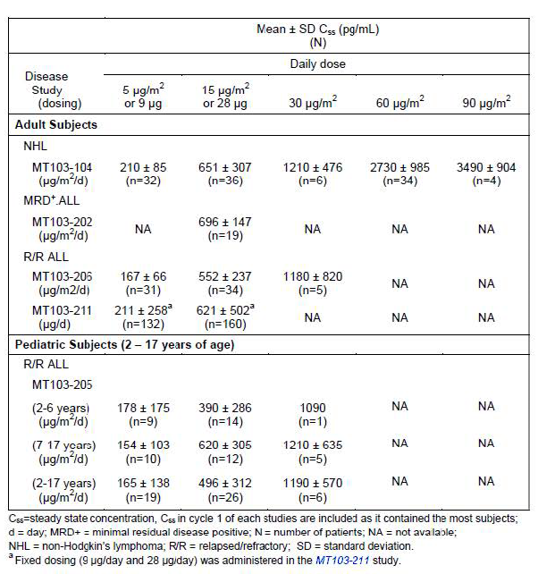 表2 Blinatumab在NHL、MRD+ ALL和R/R ALL成人受試者以及R/R ALL的兒科受試者中的平均(SD)穩(wěn)態(tài)濃度(Css)