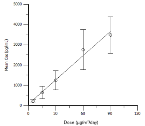 Blinatumomab在劑量比例方面表現(xiàn)出線性藥代動力學(圖4),在第1和第2周期5-90μg/m2/天的劑量范圍內(nèi),連續(xù)輸注期間穩(wěn)定的Css顯示了與時間無關(guān)的清除率(圖5)。清除率(CL)、分布體積(Vz)和消除半衰期(T1/2)的平均值(SD)分別為2.92(2.83)L/h、4.52 (2.89)L和2.1 (1.42)h(見表1)。Blinatumomab從體內(nèi)清除較快,因此需要持續(xù)靜脈輸注以維持治療。