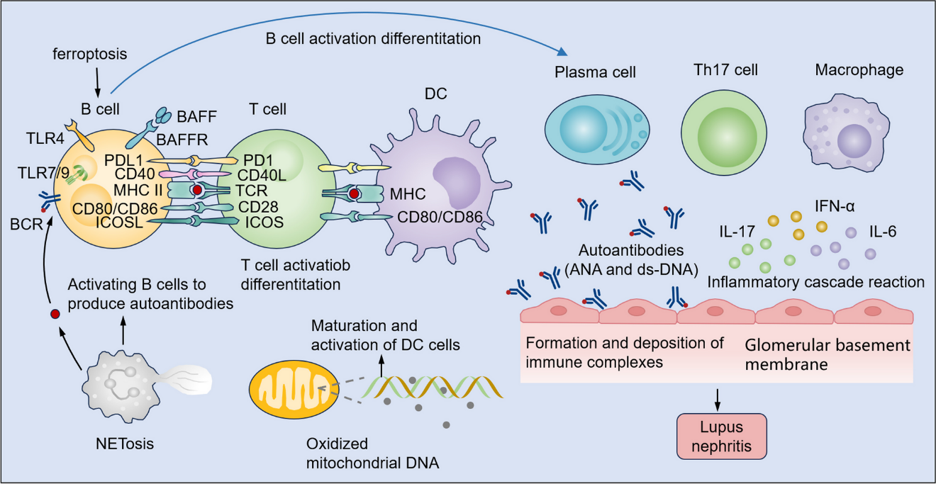 以由SLE引發(fā)的狼瘡性腎炎為例,SLE的發(fā)病機(jī)制涉及B細(xì)胞、T細(xì)胞、樹(shù)突狀細(xì)胞(DC)和其他免疫成分之間復(fù)雜的相互作用,主要包括: