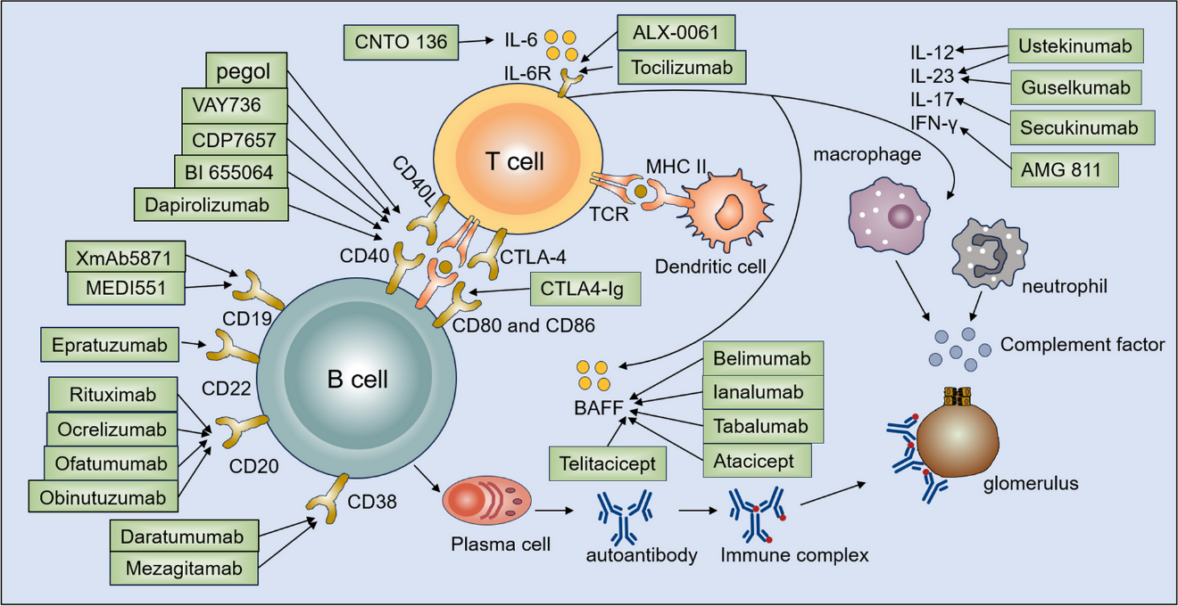針對(duì)T細(xì)胞的治療策略包括共刺激阻斷(CD40-CD40L、CD80/86-CD28、ICOS-ICOSL)和細(xì)胞因子阻斷(IL-6、IL-12、IL-17、IL-23、IFN-γ)