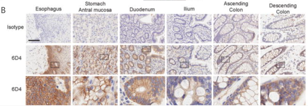ROR1在正常成人組織中的表達具有高度選擇性。根據(jù)人類蛋白質(zhì)圖譜(Human Protein Atlas)和相關(guān)研究數(shù)據(jù),ROR1在大多數(shù)正常成人組織中表達水平極低或檢測不到,例如在腦、心臟、肺和肝臟等重要器官中幾乎不存在ROR1的表達[4]。然而,ROR1在某些特定正常組織中呈現(xiàn)明顯的細胞表面染色[5,6]。例如,在甲狀旁腺、胰島細胞以及胃腸道的某些區(qū)域(如食管基底膜、胃竇和十二指腸粘膜)中,可以檢測到ROR1的顯著表達(圖2A-B)。此外,脂肪組織和某些上皮細胞中也觀察到低水平的ROR1表達。