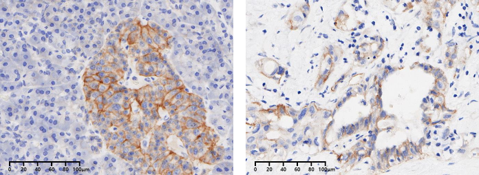ROR1的免疫組化(IHC)染色在臨床診斷和研究中具有重要意義,其染色特點主要表現(xiàn)為細胞膜和/或細胞質(zhì)的特異性著色。ROR1的陽性表達通常呈現(xiàn)為清晰的膜染色,有時伴有細胞質(zhì)染色,但單純的細胞質(zhì)染色需謹慎判讀,以避免假陽性結(jié)果。在判讀過程中,正常組織(如脂肪組織或胰腺)可作為內(nèi)對照,確保染色質(zhì)量。不同抗體的染色結(jié)果可能存在差異,建議使用經(jīng)過嚴格驗證的商業(yè)化抗體。熙寧生物已經(jīng)利用相關(guān)抗體建立起ROR1的免疫組化檢測方法,歡迎廣大客戶垂詢。