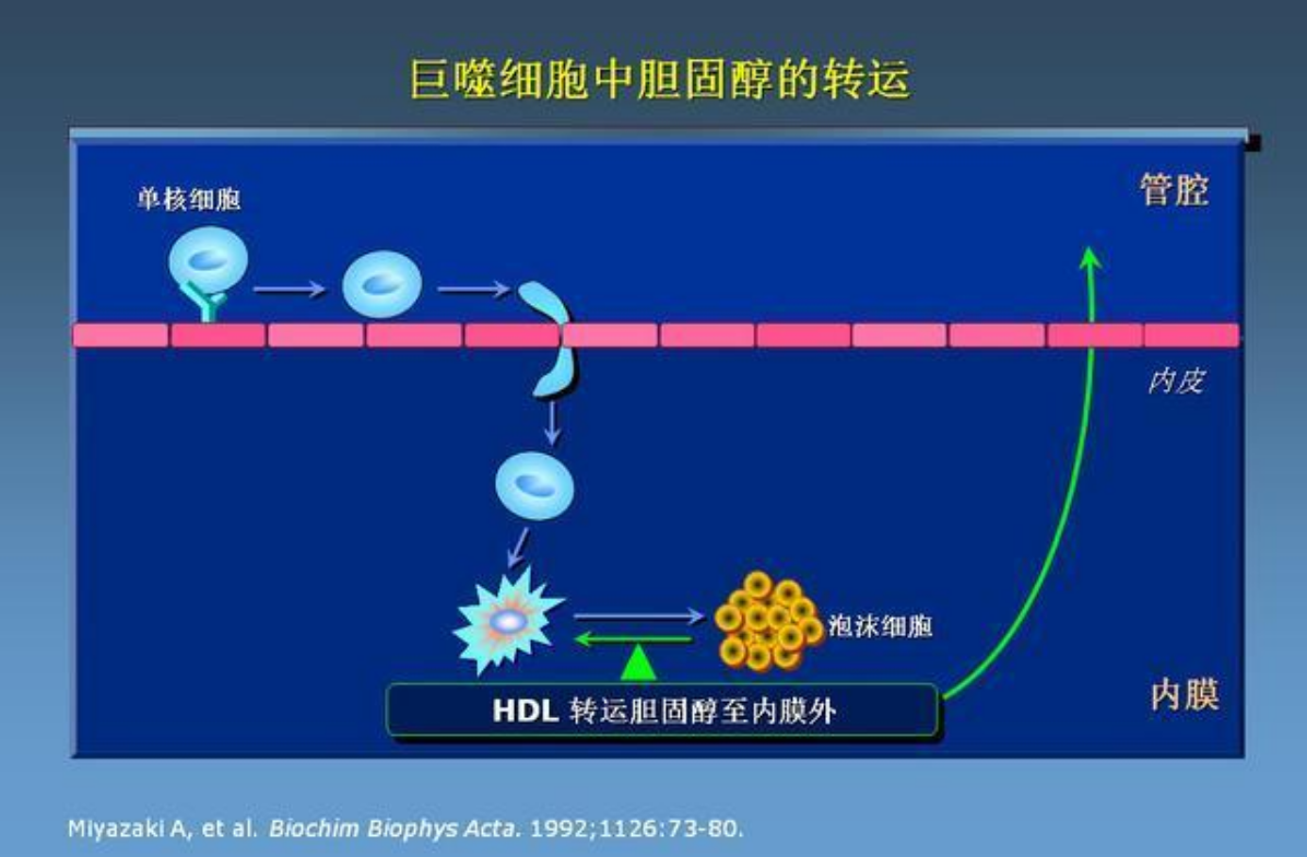 遷移至內(nèi)皮下的單核細(xì)胞在修飾后的脂質(zhì)顆粒的影響下分化為巨噬細(xì)胞。巨噬細(xì)胞通過(guò)其表面的清道夫受體識(shí)別并吞噬修飾的脂質(zhì)顆粒,該吞噬過(guò)程不受所攝取膽固醇量的調(diào)節(jié)。巨噬細(xì)胞吞噬的脂質(zhì)顆粒可通過(guò)高密度脂蛋白(High Density Lipoprotein, HDL)轉(zhuǎn)運(yùn)至內(nèi)皮外,使巨噬細(xì)胞能夠繼續(xù)吞噬脂質(zhì)顆粒,并最終完成清除工作。然而,如果脂質(zhì)顆粒沉積過(guò)多,超過(guò)HDL的轉(zhuǎn)運(yùn)能力,巨噬細(xì)胞吞噬的脂質(zhì)就會(huì)不斷增多,形成泡沫細(xì)胞,最終死亡。大量死亡的泡沫細(xì)胞聚集形成脂池,并吸引動(dòng)脈中層的平滑肌細(xì)胞遷移至內(nèi)膜。隨后,平滑肌細(xì)胞由收縮型衍變?yōu)楹铣尚?,并產(chǎn)生大量膠原和彈力纖維等,包裹脂池形成典型的粥樣硬化病變。