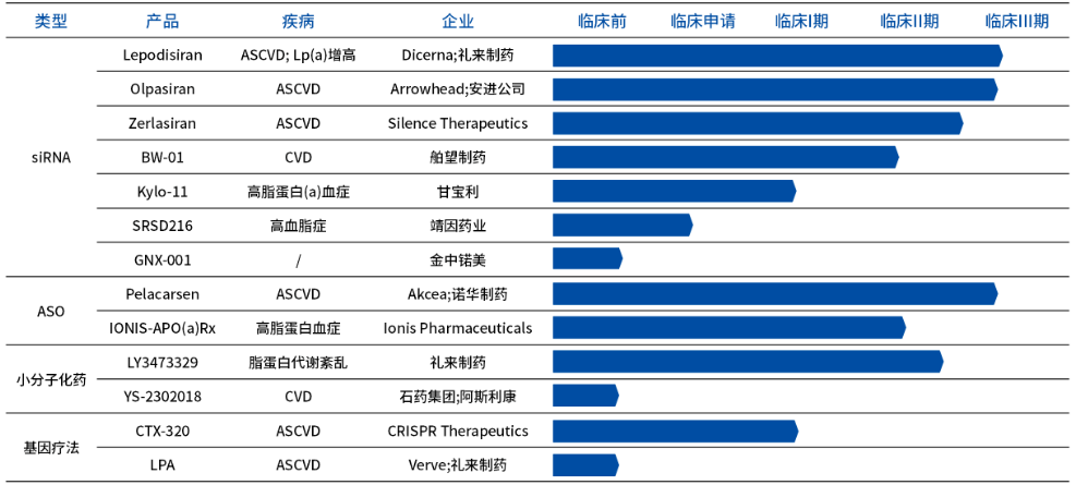 隨著心血管領(lǐng)域研究的不斷推進(jìn),對(duì)Lp(a)在心血管疾病中作用機(jī)制的理解也不斷深入,Lp(a)已成為降脂藥研發(fā)的新靶點(diǎn)。目前,全球范圍內(nèi)尚無(wú)靶向Lp(a)的藥物獲批上市,相關(guān)產(chǎn)品研發(fā)進(jìn)展如下: