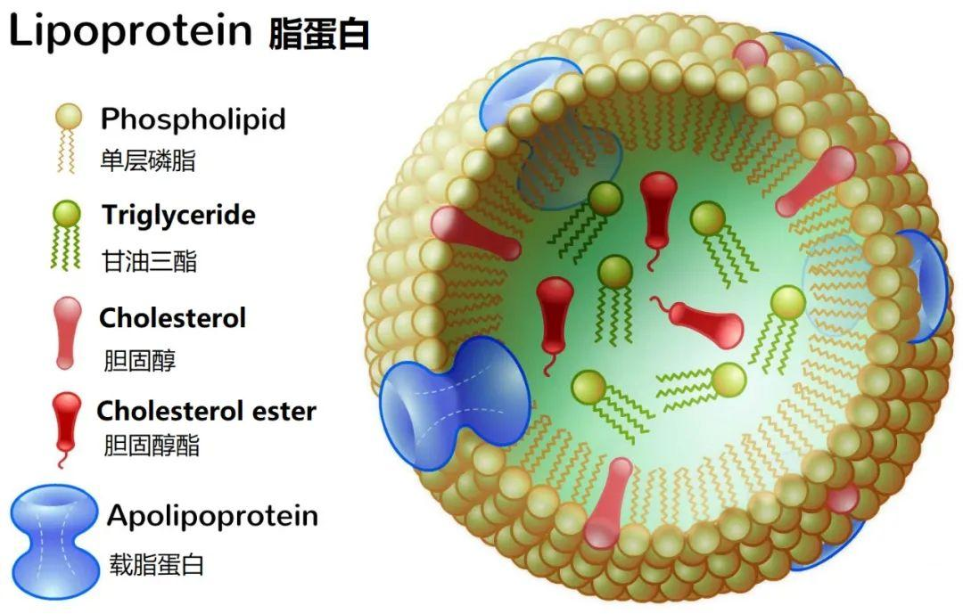 脂蛋白是指血液中運(yùn)送水不溶性脂類(lèi)的超分子組裝體(球狀微粒),由富含膽固醇酯、甘油三酯的疏水性?xún)?nèi)核和由載脂蛋白、單層磷脂、膽固醇等組成的外殼構(gòu)成。