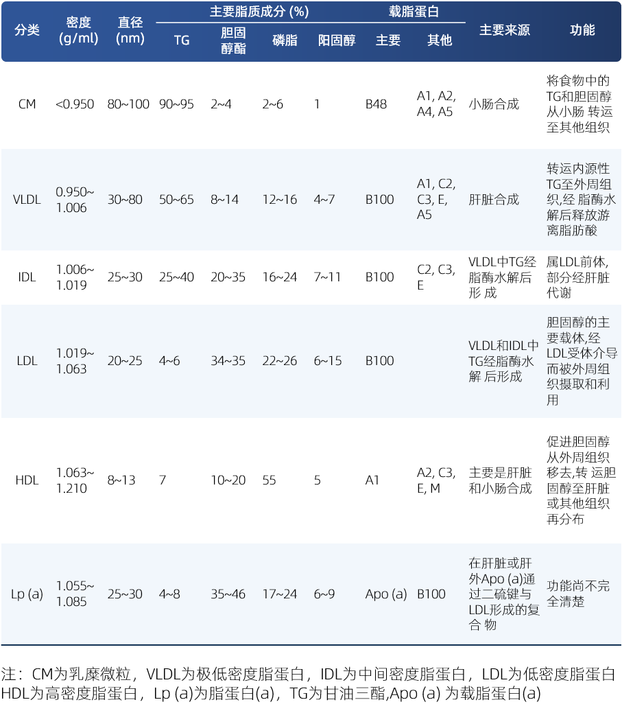 脂蛋白根據(jù)其水合密度、顆粒大小和載脂蛋白等的不同,分為乳糜微粒(Chylomicron,CM)、極低密度脂蛋白(Very Low?Density Lipoprotein,VLDL)、中間密度脂蛋白(Intermediate?Density Lipoprotein,IDL)、低密度脂蛋白(Low?Density Lipoprotein,LDL)和高密度脂蛋白(High?Density Lipoprotein,HDL)。如果進(jìn)一步細(xì)分,VLDL可分為5個(gè)亞類(lèi)(VLDL 1-5),LDL可分為6個(gè)亞類(lèi)(LDL 1-6),HDL可分為4個(gè)亞類(lèi)(HDL 1-4),各亞類(lèi)的表達(dá)與功能不盡一致。此外,在LDL和HDL區(qū)帶之間,還存在一種特殊的脂蛋白—脂蛋白(a)[lipoprotein(a),Lp(a)],它是ASCVD的一項(xiàng)獨(dú)立的前瞻性危險(xiǎn)性因素。脂蛋白的物理特性、主要成分、來(lái)源和功能如圖3所示。目前臨床上脂蛋白檢測(cè)的項(xiàng)目為L(zhǎng)p(a)等,但由于脂蛋白在血液中一般呈球狀,不易直接測(cè)定,因此臨床上常通過(guò)檢測(cè)血脂和載脂蛋白的含量來(lái)間接了解血液中脂蛋白的含量。