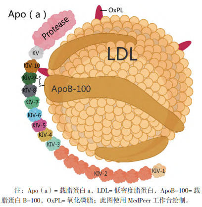 Lp(a)由Apo(a)和包含載脂蛋白B-100(ApoB-100)的LDL類(lèi)似顆粒按1:1的比例,通過(guò)二硫鍵連接而成,詳見(jiàn)圖5[14]。Apo(a)由肝細(xì)胞合成分泌,是一種高度多態(tài)性的親水性糖蛋白,包含被稱(chēng)為Kringle的環(huán)狀蛋白質(zhì)結(jié)構(gòu),含有Kringle 4(KⅣ)型和Kringle 5(KV)型兩種結(jié)構(gòu)域。KⅣ有10種類(lèi)型結(jié)構(gòu),KⅣ-2結(jié)構(gòu)的重復(fù)次數(shù)由遺傳決定且差異巨大,從而導(dǎo)致Apo(a)大小的多態(tài)性,其分子大小跨度在187kDa到662kDa范圍內(nèi)。除上述主體結(jié)構(gòu)以外,Apo(a)還連接有一段無(wú)無(wú)蛋白水解活性的蛋白酶結(jié)構(gòu)域,并且可以與OxPL結(jié)合,具有促炎活性。