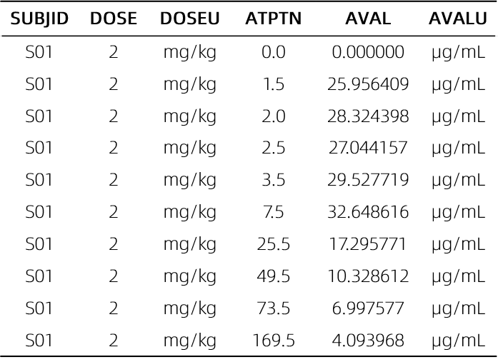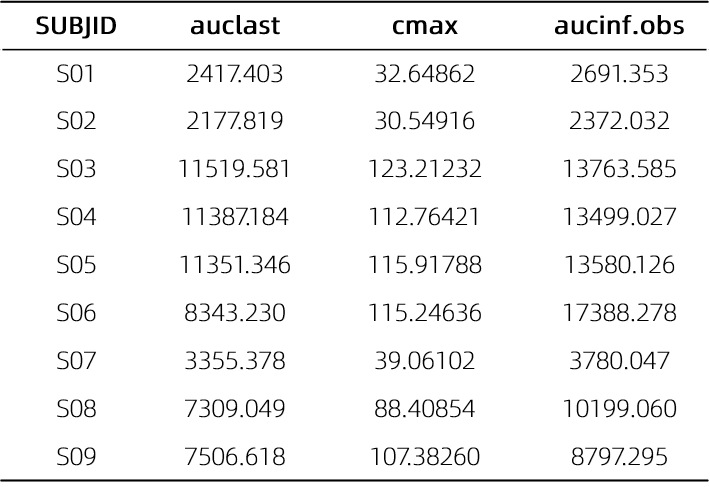 # 設置PK參數(shù)計算的單位轉換表ppunits <- pknca_units_table(concu="ug/mL", doseu="mg/kg", amountu="mg", timeu="hr")conc_raw <- arrange(pc, SUBJID,ATPTN)# 設置濃度數(shù)據conc_obj_multi <- PKNCAconc(data=conc_raw,formula=AVAL~ATPTN|SUBJID)# 設置劑量數(shù)據dose_raw <- select(conc_raw,ATPTN,DOSE,SUBJID) %>% distinct()dose_obj_multi <- PKNCAdose(dose_raw,DOSE~ATPTN|SUBJID,route="intravascular",duration=1.5)# 設置參數(shù)計算時間區(qū)間intervals_manual <- data.frame(start=0,end=504,cmax=TRUE,auclast=TRUE,aucinf.obs=TRUE)o_data <- PKNCAdata(conc_obj_multi, dose_obj_multi,intervals=intervals_manual,units=ppunits)# 計算PK參數(shù)o_results <- pk.nca(o_data)# 結果呈現(xiàn)ncasingle <- o_results[["result"]] %>%select(SUBJID,start,end,PPTESTCD,PPORRES,PPORRESU) %>%filter(PPTESTCD %in% c("cmax","auclast","aucinf.obs"))# 輸出PK參數(shù)kable(pivot_wider(ncasingle,id_cols=1,names_from = "PPTESTCD", values_from = "PPORRES"))
