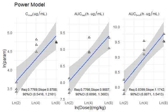 # 劑量與參數(shù)的自然對數(shù)rst <- left_join(ncasingle,distinct(dose_raw,DOSE,SUBJID),by="SUBJID") %>%mutate(logx=log(DOSE),logy=log(PPORRES),PPTESTCD=factor(PPTESTCD,levels=c("cmax","auclast","aucinf.obs")))# 模型擬合split <- split(rst,~PPTESTCD,drop=TRUE)lmci <- map(split,\(x) data.frame(PPTESTCD=unique(x$PPTESTCD),logx=lm(logy~logx,x)[["coefficients"]][["logx"]],Rsq=summary(lm(logy~logx,x))[["r.squared"]],confint(lm(logy~logx,x), "logx", level= 0.90 ))) %>%bind_rows() %>%# 設置繪圖呈現(xiàn)格式mutate(.logx=formatC(`logx`,digits=4,format = "f"),lwci=formatC(`X5..`,digits=4,format = "f"),upci=formatC(`X95..`,digits=4,format = "f"),Rsq=formatC(`Rsq`,digits=4,format = "f"),ci=str_c("Rsq:",Rsq,";Slope:",.logx,";\n90%CI (",lwci,", ",upci,")"),) %>%select(PPTESTCD,ci)# 劑量線性繪圖呈現(xiàn)(base <- ggplot(rst,aes(x=logx,y=logy)) +geom_point(shape=24) +geom_smooth(method = "lm", se = TRUE) +geom_text(aes(x=1.5,y=-Inf,label=ci),data=lmci,size=3,vjust=-0.5) +scale_x_continuous(breaks=c(0.69,1.38,2.08),labels=c("Ln(2)","Ln(4)","Ln(8)")) +labs(title = "Power Model",x="ln(Dose)(mg/kg)",y="ln(param)") +facet_wrap(vars(PPTESTCD),scales = "free", axes="all" ,labeller = as_labeller(c("cmax"="C[max](ug/mL)","auclast"="AUC[last](h%.%ug/mL)","aucinf.obs"="AUC[0-inf](h%.%ug/mL)"),,default = label_parsed)) +theme_minimal())