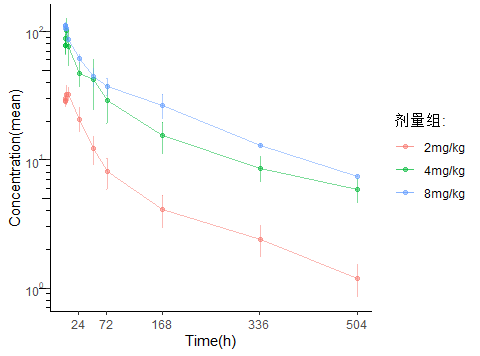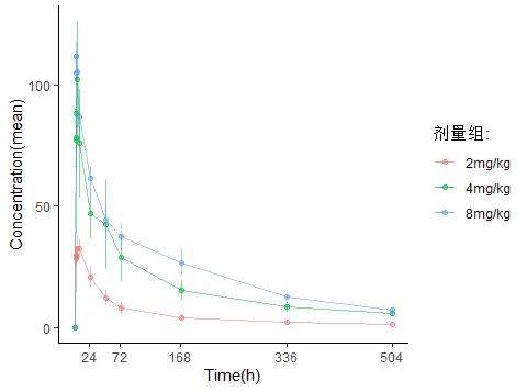 pcsas % mutate( aval=as.numeric(AVAL), DOSE=str_c(DOSE,DOSEU) ) # 分組時點血藥濃度定量統(tǒng)計stplot % group_by(DOSE,ATPTN) %>% summarise( Mean=mean(aval,na.rm = TRUE), SD=sd(aval,na.rm = TRUE), lower=ifelse(is.na(SD) | Mean-SD % ungroup()# 線性血藥濃度-時間曲線(normal % ggplot(aes(x = ATPTN, y = Mean ,colour=DOSE)) + geom_errorbar(mapping=aes(ymin=lower, ymax=upper),width = 0.5,alpha=0.5) + geom_line(linewidth = 0.5,alpha=0.5) + geom_point(alpha=0.5) + scale_x_continuous(breaks=c(24,72,168,336,504)) + labs(x="Time(h)",y="Concentration(mean)",colour="劑量組:",title = "藥時曲線") + theme_classic() )