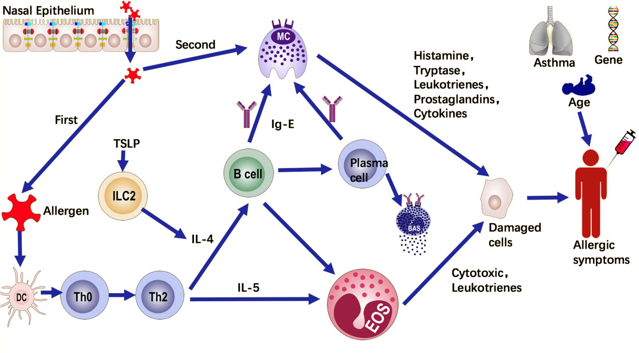 過敏原識(shí)別:吸入性過敏原進(jìn)入鼻黏膜后,被抗原呈遞細(xì)胞(APC)識(shí)別捕獲,激活 Th2 細(xì)胞并誘導(dǎo) B 細(xì)胞產(chǎn)生特異性 IgE 抗體。