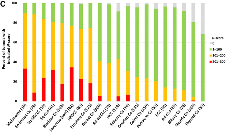 乳腺癌、卵巢癌、肺鱗癌、肝細胞癌及胃腺癌中,
