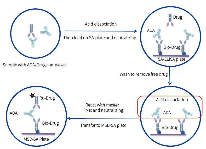 可采用橋聯(lián)法來設(shè)計(jì)ADA檢測模式,為了改善藥物耐受,采用酸化解離樣品后經(jīng)固相包被藥物的載體捕獲ADA,然后將ADA酸洗脫下來的方式進(jìn)行樣品純化后檢測。純化后的樣品也可采取物理吸附的方式結(jié)合到分析板上,然后用標(biāo)記的藥物作為檢測試劑進(jìn)行檢測。