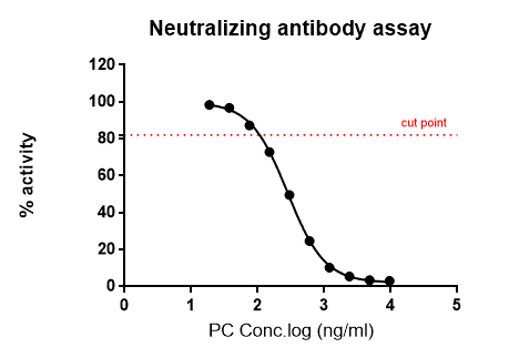 Dulaglutide中和抗體有明顯的抑制Dulaglutide刺激GLP-1R報(bào)告基因穩(wěn)轉(zhuǎn)細(xì)胞株的作用,中和抑制曲線明顯,中和抗體的靈敏度約為150ng/mL,方法學(xué)靈敏。