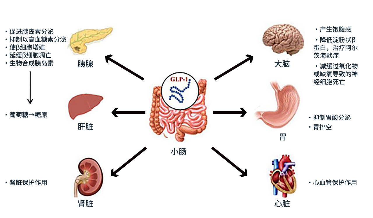 GLP-1即胰高血糖素樣肽,屬于腸促胰島素家族,以葡萄糖濃度依賴性方式促進(jìn)胰島β細(xì)胞分泌胰島素,參與機(jī)體血糖穩(wěn)態(tài)調(diào)節(jié)。人體分泌的GLP-1半衰期很短,僅為1~2分鐘,分泌到血液循環(huán)后易被二肽基肽酶4(DPP-4)快速降解而失去促胰島素分泌的活性。GLP-1可減緩胃排空,還可作用于中樞神經(jīng)系統(tǒng)上的受體,從而降低食欲,最終起到降低血糖與體重的作用。此外,GLP-1藥物在非酒精性脂肪肝、心血管疾病和神經(jīng)系統(tǒng)疾病治療方面也具有潛在的治療價(jià)值。
