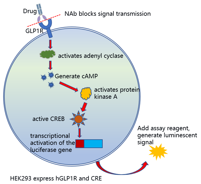 功能細(xì)胞株高表達(dá)GLP-1R,GLP-1的結(jié)合使細(xì)胞活化,胞內(nèi)cAMP 濃度上升,通過下游信號(hào)通路,激活熒光素酶報(bào)告基因的轉(zhuǎn)錄,在加入底物后產(chǎn)生化學(xué)信號(hào)。當(dāng)中和抗體存在時(shí)會(huì)阻礙藥物和細(xì)胞上的GLP-1R結(jié)合,抑制細(xì)胞的活化,表現(xiàn)為信號(hào)降低。
