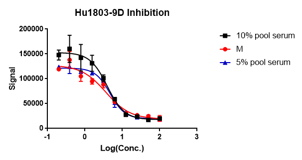 Glucagon作為刺激劑, Hu1803-9D標(biāo)準(zhǔn)曲線梯度稀釋加入體系中。結(jié)果顯示,Hu1803-9D對Glucagon的抑制作用隨Hu1803-9D濃度升高而增大,且在含有5%混合人血清的環(huán)境中與培養(yǎng)基組沒有明顯差異。