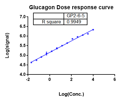 標(biāo)準(zhǔn)品為Glucagon(1-29),Human。結(jié)果顯示GLP-1R報(bào)告基因穩(wěn)轉(zhuǎn)細(xì)胞株復(fù)孔間信號(hào)CV非常小,有明顯的劑量依賴信號(hào)響應(yīng),信號(hào)窗口S/N大于100倍。