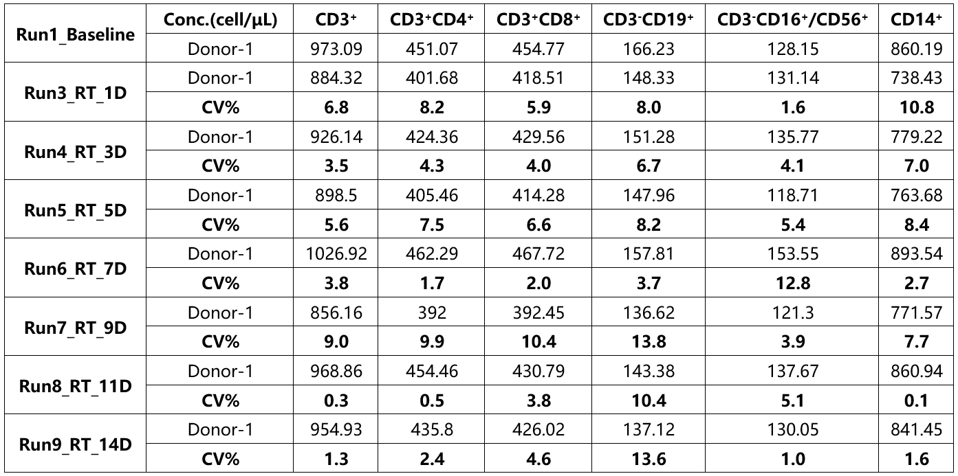注:使用特殊采血管采集的人全血,室溫儲存14天后,與基線相比%CV范圍為0.3%-13.8%。