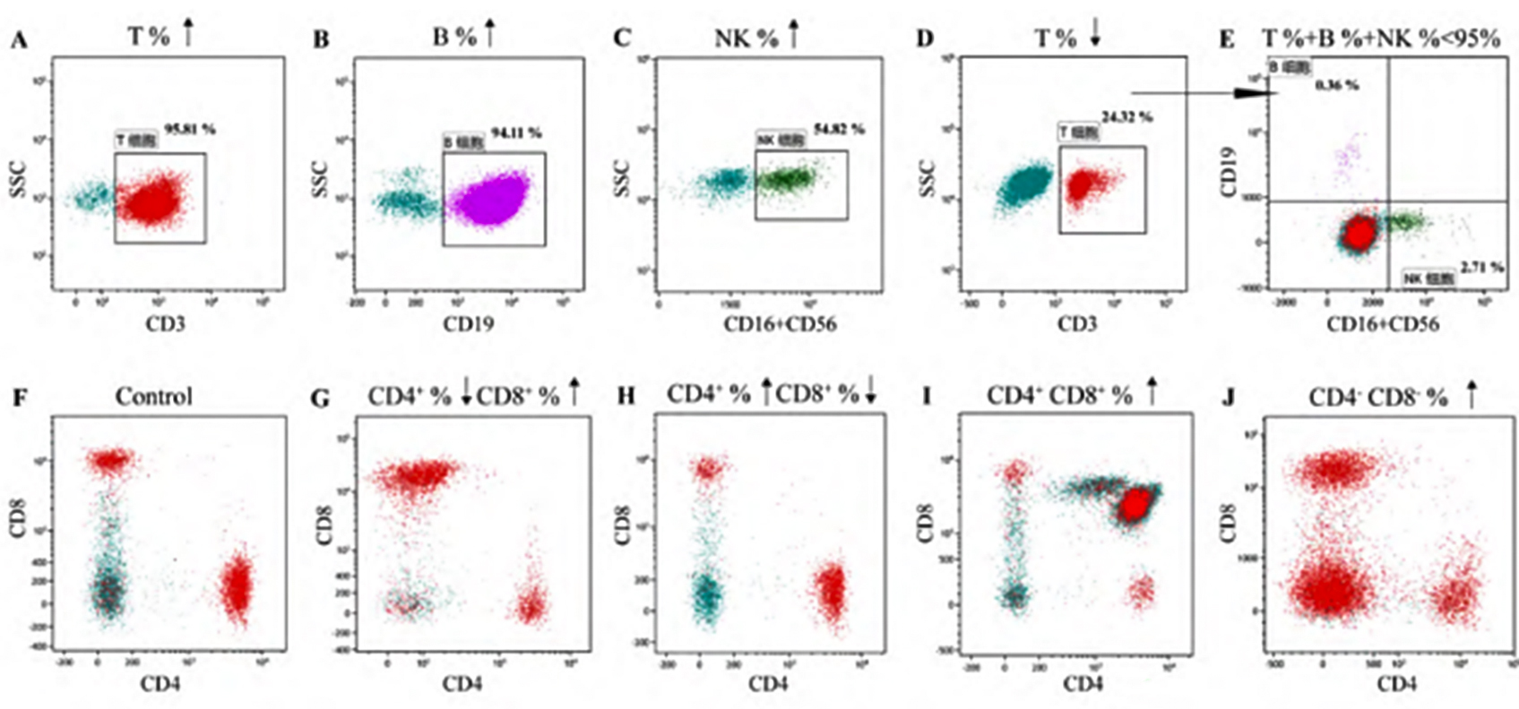 注:A表示T淋巴細(xì)胞群比例增高;B表示B淋巴細(xì)胞群比例增高;C表示NK細(xì)胞群比例增高;D、E表示同一患者T、B、NK三群淋巴細(xì)胞比例之和小于95%,存在不表達(dá)CD3、CD19、CD16和CD56的淋巴細(xì)胞;F表示CD4+T、CD8+T淋巴細(xì)胞群比例大致正常;G表示CD4+T淋巴細(xì)胞群比例降低,CD8+T淋巴細(xì)胞群比例增高;H表示CD4+T淋巴細(xì)胞群比例增高,CD8+T淋巴細(xì)胞群比例降低:I表示中CD4+CD8+T淋巴細(xì)胞群比例增高:J表示 CD4-CD8-T淋巴細(xì)胞群比例增高。