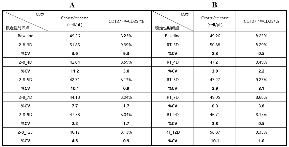 注:該方法已經(jīng)過熙寧生物|精翰生物內(nèi)部全驗證,可直接支持樣品分析。“CD127-/lowCD25+%” 為CD127-/lowCD25+占父群的比例,即Treg占CD4+T細(xì)胞亞群的比例。A,室溫儲存穩(wěn)定性數(shù)據(jù),與基線相比%CV范圍為:0.9%-11.2%。B,2-8℃儲存穩(wěn)定性數(shù)據(jù),與基線相比%CV范圍為:0.3%-10.1%。