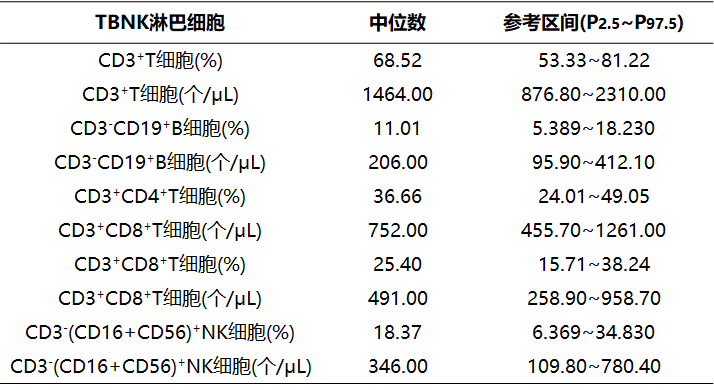表3 健康成年人外周血TBNK淋巴細(xì)胞參考區(qū)間