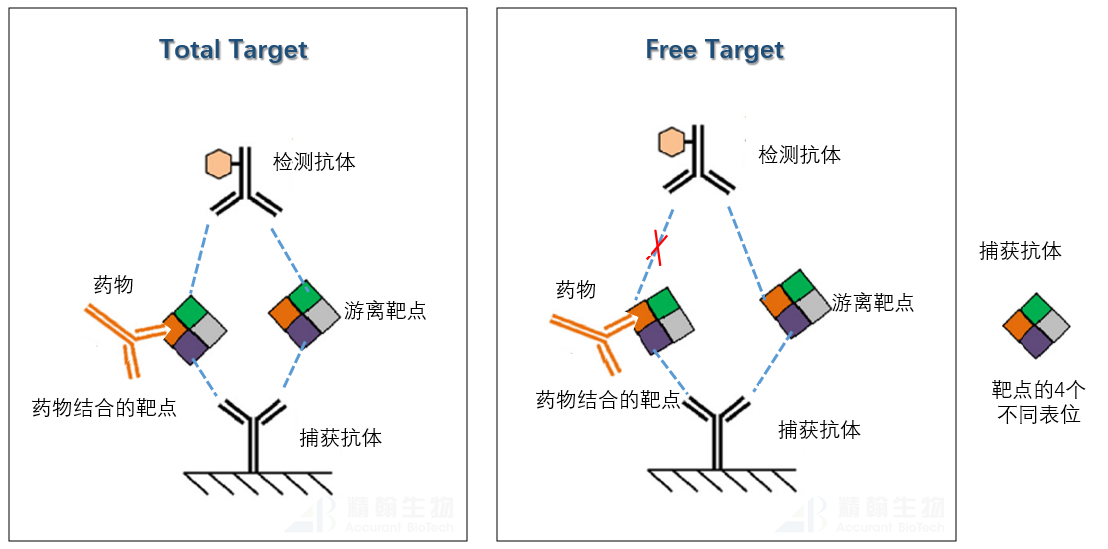 Total target:抗體對(duì)中兩個(gè)抗體與藥物均是非競(jìng)爭(zhēng)關(guān)系。檢測(cè)抗體及捕獲抗體和藥物結(jié)合靶點(diǎn)的位點(diǎn)均是不相同的。
