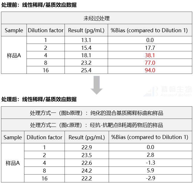 檢測(cè)中通過對(duì)樣品高度稀釋來減少未知來源的基質(zhì)干擾,但此方式會(huì)引起靶點(diǎn)-藥物復(fù)合物的解離并與檢測(cè)試劑結(jié)合,這可能導(dǎo)致對(duì)游離靶點(diǎn)的潛在高估。此問題有兩種解決方案:①開發(fā)較小稀釋倍數(shù)或不稀釋樣本的分析方法;②稀釋樣本并恰當(dāng)?shù)貓?bào)告結(jié)果。