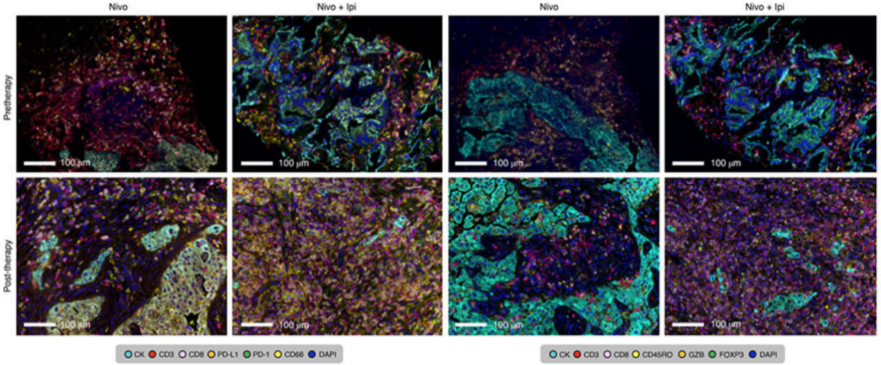在一項針對可手術(shù)的非小細胞肺癌新輔助治療(納武利尤單抗單獨或聯(lián)用伊匹木單抗)II期臨床試驗研究中,采用mIHC技術(shù)檢測了治療前后的腫瘤組織樣本,發(fā)現(xiàn)在兩種藥物聯(lián)合治療后,CD3+及CD3+CD8+的TILs顯著增加,且出現(xiàn)CD3+CD8+CD45RO+記憶TILs密度增高的趨勢。與此同時,聯(lián)合用藥也可誘導不同免疫細胞亞群的浸潤,如CD3+CD8+PD-1+的T細胞、CD3+CD8+GZB+的T細胞、CD3+CD8-FoxP3+的T細胞、CD68+及CD68+PD-L1+的細胞。而單獨使用納武利尤單抗治療前后,免疫細胞亞群沒有實質(zhì)性的改變。可見mIHC技術(shù)可用于觀測治療后的免疫響應程度,從而對預后做出評估,有助于個體化用藥/治療的實施[4]。