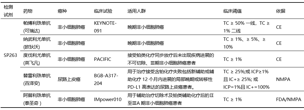 下表中列出了部分PD-L1表達(dá)檢測(cè)使用SP263抗體的臨床試驗(yàn),及基于PD-L1表達(dá)分層分析的療效數(shù)據(jù)形成的臨床cut-off值(表4)。