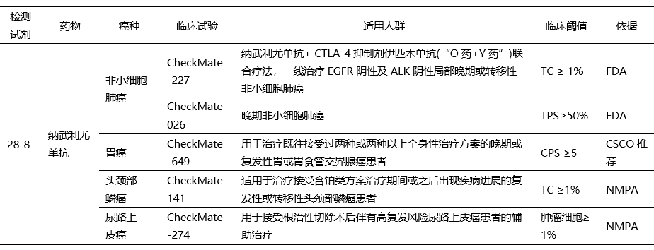 后續(xù)針對(duì)多個(gè)適應(yīng)癥的臨床試驗(yàn)中PD-L1表達(dá)檢測(cè)都使用了28-8抗體,并基于療效數(shù)據(jù)在不同適應(yīng)癥中形成了臨床cut-off值(表3)。