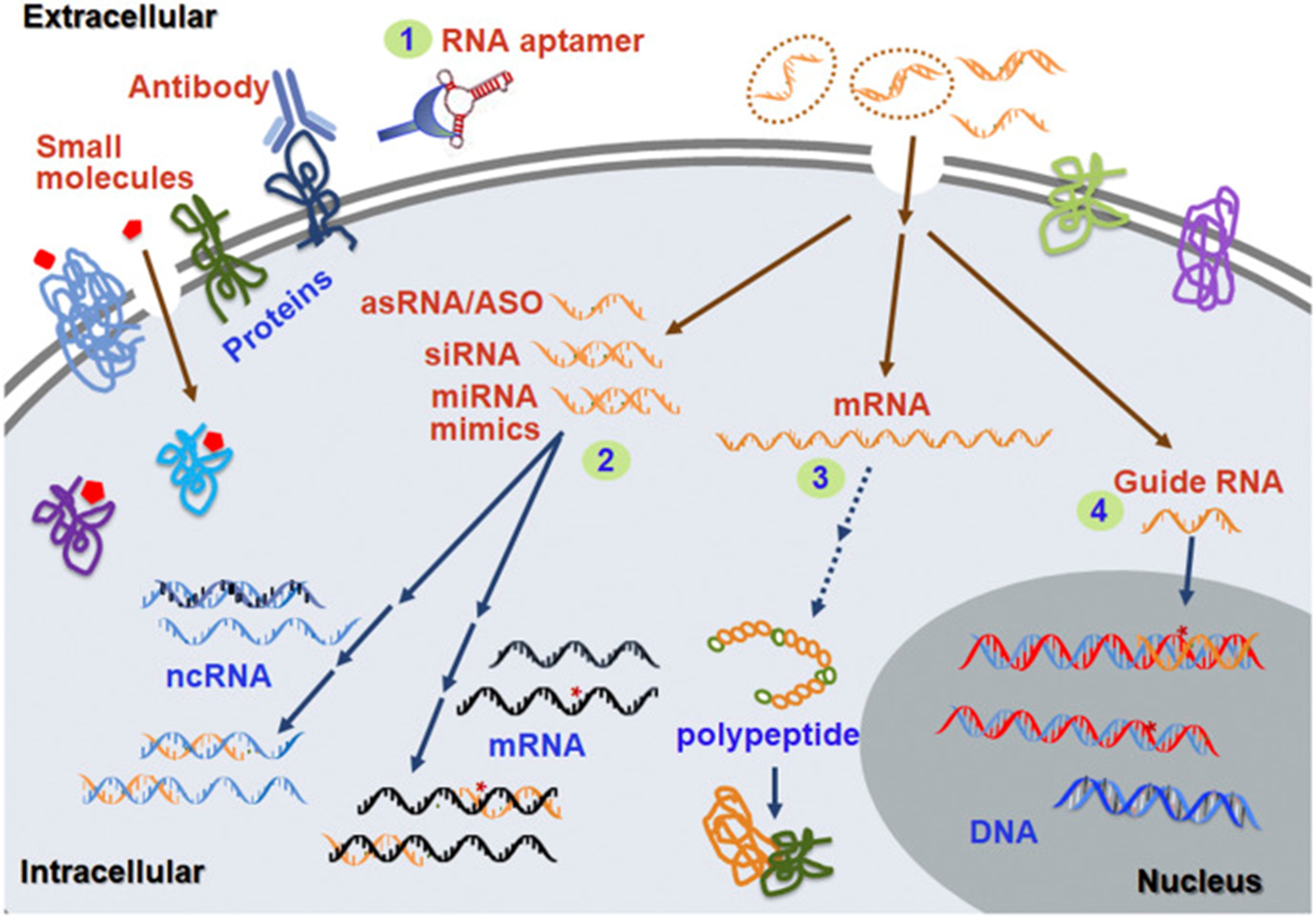 圖2 小核酸藥物將靶點(diǎn)從蛋白水平擴(kuò)展到RNA和DNA水平