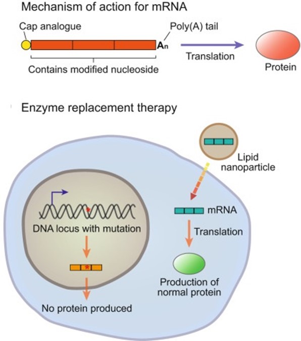 外源mRNA進(jìn)入體內(nèi)后,由自體細(xì)胞表達(dá)出特定的蛋白質(zhì),通過內(nèi)源表達(dá)功能蛋白來發(fā)揮其治療作用。