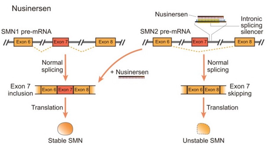Nusinersen作為ASO藥物,能夠與SMN2外顯子7的調(diào)控序列結(jié)合,取代hnRNP,從而翻譯形成全長(zhǎng)的SMN蛋白,增加功能性SMN蛋白的水平,改善患者的運(yùn)動(dòng)神經(jīng)元功能并減緩疾病進(jìn)展。