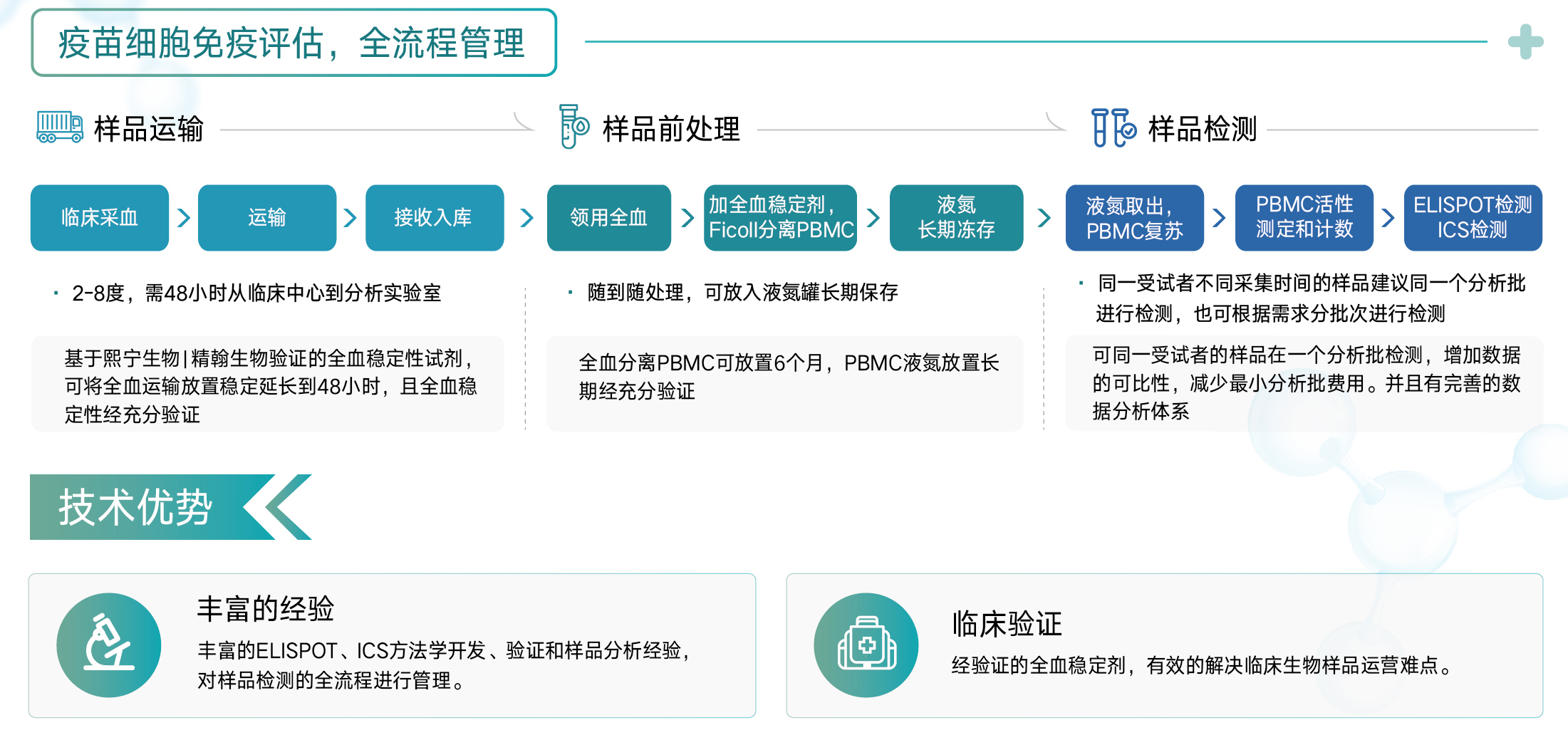 熙寧生物|精翰生物具備完善的細(xì)胞免疫研究(ELISPOT和ICS)解決方案和數(shù)據(jù)匯報體系,自主開發(fā)的全血穩(wěn)定劑可解決疫苗細(xì)胞免疫研究臨床運(yùn)營痛點(diǎn),在大樣本項(xiàng)目的管理方面擁有豐富的經(jīng)驗(yàn),可提供完善的中心實(shí)驗(yàn)室服務(wù)。