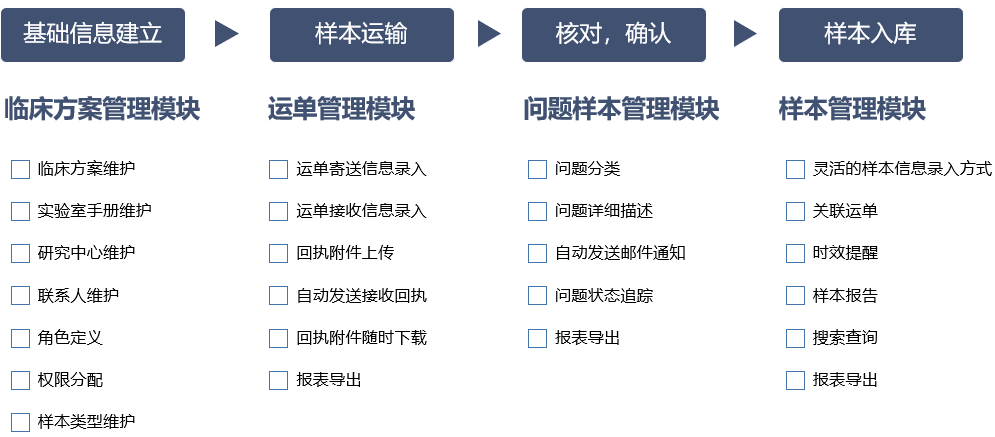 熙寧|精翰樣品管理系統(tǒng)從樣本臨床方案的管理開始,到樣本寄送、接收,核對、確認(rèn),入庫各個(gè)環(huán)節(jié),對臨床試驗(yàn)樣本進(jìn)行追蹤管理。下圖是該系統(tǒng)的功能概覽: