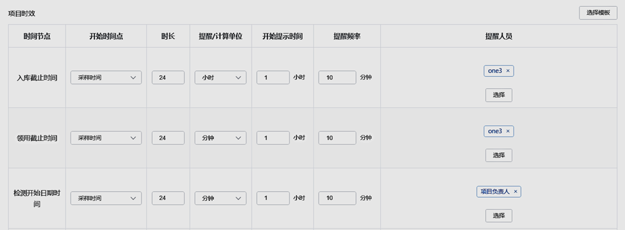 7.可以在系統(tǒng)中對時(shí)效樣本進(jìn)行提醒和追蹤。中心實(shí)驗(yàn)室項(xiàng)目經(jīng)理可以為某個(gè)項(xiàng)目的每一個(gè)步驟設(shè)置時(shí)效。比如:從樣本采集開始計(jì)時(shí),24小時(shí)為入庫的截止時(shí)間,在截止時(shí)間之前的1個(gè)小時(shí)開始提醒,提醒頻率為10分鐘,并設(shè)置提醒人員。
