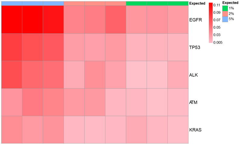 細胞株混合物不同梯度的低頻突變重復檢出結(jié)果