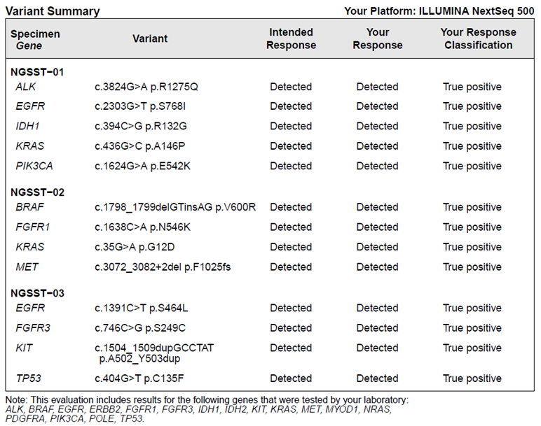 NGSST-A是2023年上半年CAP組織用于評估全球基因檢測實驗室使用二代測序(Next-Generation Sequencing,NGS)方法,檢測實體瘤組織基因變異能力的項目。本次共檢測三個樣本,樣本編號為NGSST-01、NGSST-02、NGSST-03,主要涵蓋ALK、EGFR、IDH1、KRAS、PIK3CA、BRAF、FGFR1、KRAS、MET、FGFR3、KIT、TP53等常見突變基因 ,涉及SNV、Indel等突變類型。整個過程涵蓋實驗操作、生物信息分析、結(jié)果解讀等全流程,熙寧生物|精翰生物檢測結(jié)果與CAP所公布的標準結(jié)果100%一致。
