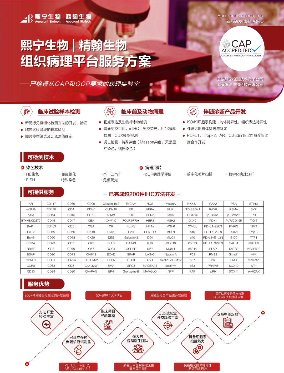 熙寧生物|精翰生物組織病理實驗室秉承“合規(guī),精準,伴隨診斷”的核心理念,擁有BenchMark Ultra,Dako Autostainer Link 48,Leica Bond III,Leica Bond Rx等國際公認的免疫組化染色平臺,遵從CAP和GCP體系要求,成功完成包括PD-L1、HER2、Claudin18.2、TROP-2、HER-3、Nectin-4、dMMR、TIM-3、MSLN、B7H3等近200種靶標的免疫組化方法開發(fā),且多種方法已獲得NordiQC、CAP、CCPI、PQCC等國內外權威機構的認可。